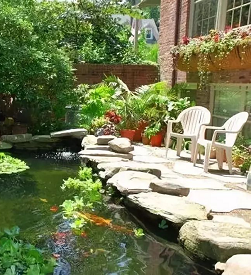 水景,可以讓別墅小院立刻有了靈魂。一般庭院水景通常分為瀑布跌水、生態(tài)水景、溪流、泳池靜水以及其他裝飾水景。人工瀑布主要采用天然石材或仿石材設置瀑布的背景和引導水的流向。