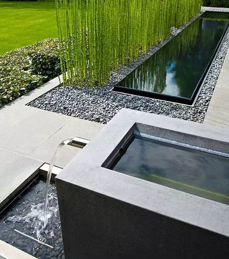 靜態(tài)水則以泳池、水缽、鏡面水池等為主,在庭院中,一般搭配以植物,打造出簡(jiǎn)潔明朗的空間,給人寧?kù)o、安心的體驗(yàn)。這種形式的水景面積一般不宜過(guò)大,否則會(huì)讓庭院本來(lái)有限的空間顯得單調(diào)、空洞,而且實(shí)用性也不足。