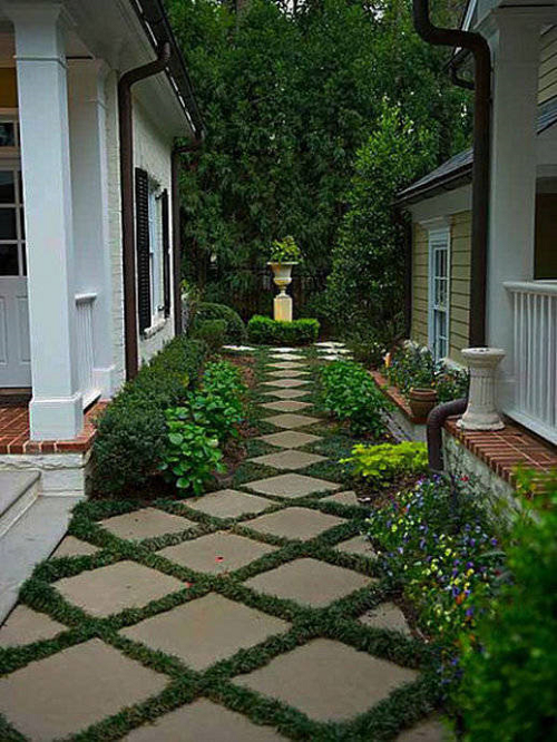 鑲嵌式:地磚材料鑲嵌在草坪、植物中,有別于傳統(tǒng)的草坪鋪設(shè),新穎又別致。