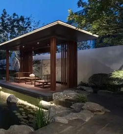 新中式別墅庭院設計元素有廊架、花卉、流水、石頭、綠植、菜園等。